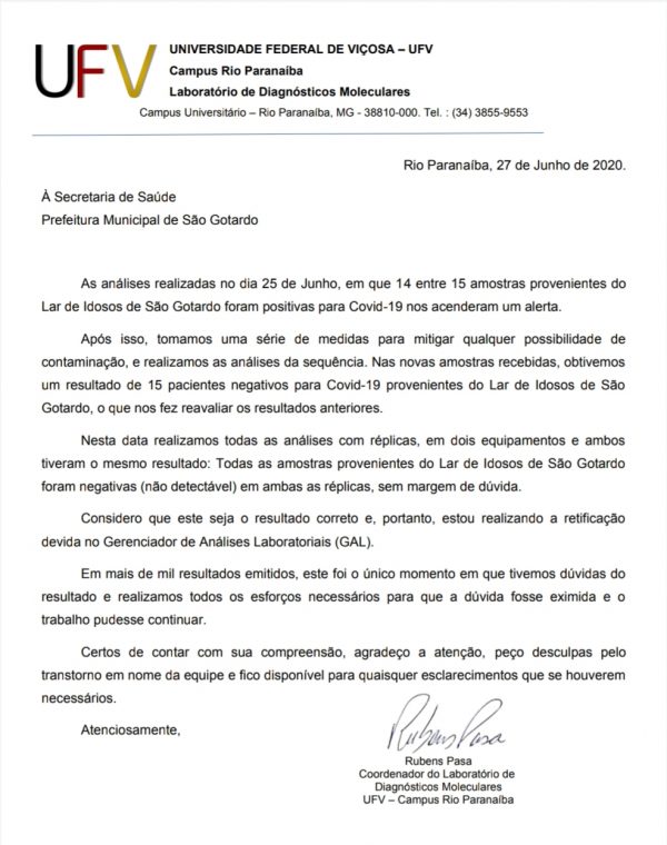Quatorze (14) pessoas que foram notificadas como positivadas para o novo Coronavírus no Lar do Idoso de São Gotardo, tiveram uma boa notícia neste último sábado (27/06). Após notar inconclusividades nos exames, o Laboratório da Universidade Federal de Viçosa, Campus Rio Paranaíba, responsável por realizar os exames que detecta a presença do Covid-19 em pacientes de várias cidades do Alto Paranaíba, divulgou uma nota oficial admitindo que os resultados de tais exames, havia tido um resultado errôneo, negativando os quinze casos que inicialmente haviam dado positivo para o novo Coronavírus (CONFIRA A NOTA NA ÍNTEGRA NO FINAL DESTA REPORTAGEM).