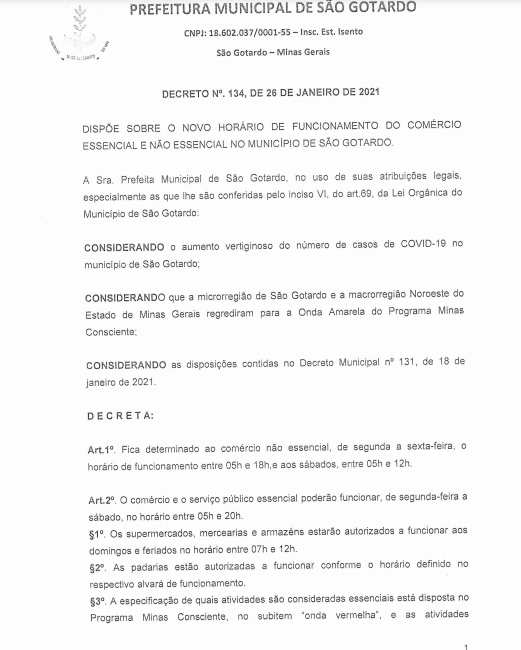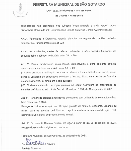 O novo Decreto Municipal de São Gotardo passa a valer a partir desta quinta-feira (28/01). Todos os descumprimentos do Decreto estão sujeitos a multa e crime administrativo contra o município, além de processo judicial, conforme informou a Promotoria de Justiça da cidade.