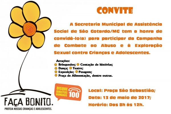 Com o tema “Faça Bonito. Proteja nossas crianças e adolescentes”, a campanha de combate ao abuso e exploração sexual de crianças e adolescentes de São Gotardo, tem como objetivo conscientizar e esclarecer para as famílias, crianças e adolescentes que passam por este tipo de “abuso”, a forma correta de denunciar e evitar tais possíveis violências.