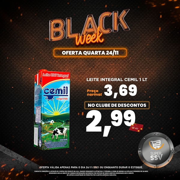 Confira algumas ofertas exclusivas da BLACK WEEK Super SSV: Leite Integral Cemil 1 LT de 3,99 por apenas 2,99 no Cartão Clube de Descontos, Lombo Suíno por apenas 14,99 o KG no Cartão Clube de Descontos, Galinha BIG FRANGO PÇ/KG de 11,99 por apenas 7,99 no Cartão Clube de Descontos, Mussarela SG LAC KG de 41,99 por apenas 24,99, Amaciante Downy 500 ML Fragrâncias de 9,99 por apenas 6,99 no Cartão Clube de Descontos, Sabão Ypê Barra 1 KG de 10,99 por apenas 7,99 no cartão Clube de Descontos e Creme de Leite Quatá 200 GR de 2,49 por apenas 1,49 a unidade no Cartão Clube de Descontos Super SSV.