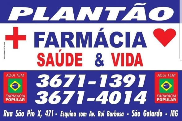 Leitores, confiram as FARMÁCIAS DE PLANTÃO em São Gotardo durante esta semana (CONFIRA TODAS AS FARMÁCIAS DE PLANTÃO NO FINAL DESTA REPORTAGEM). O plantão começa neste sábado (15/08) e dura até o dia 21 de Agosto de 2020. As farmácias ficam abertas todos os dias até as 22:00 horas.