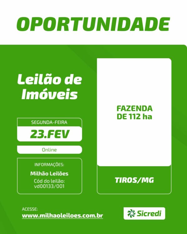 0 Comentários “LEILÃO SICREDI: Venda direta de uma gleba de terras da Fazenda Aroeira e Santa Marta, em Tiros-MG”
