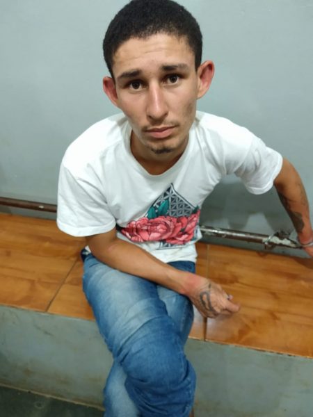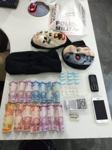 Quando as viaturas policiais se aproximavam do local, o alvo das denúncias, D.O.G. de 19 anos, tentou evadir adentrando em sua residência, porém foi alcançado e abordado. Durante a busca pessoal foram localizados no bolso da calça dele 10 (dez) pinos de cocaína, 15 (quinze) pedras de crack e R$88,00 (oitenta e oito reais) em dinheiro. Durante buscas na residência do autor foram localizadas 01 (uma) balança de precisão, 02 (dois) pinos de cocaína, 02 (dois) aparelhos celulares sem prova de origem, 01 (um) canivete com resquícios de drogas, 01 (uma) caixa de lâminas que geralmente são utilizadas para fracionar drogas, 01 (uma) touca ninja e 02 (duas) máscaras.