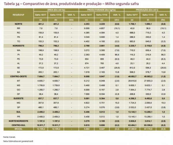 Na safrinha de 2018, a área semeada com o milho deverá ficar próxima da registrada no ciclo anterior, apesar do atraso observado no plantio da soja da safra 2017/18. Na safra passada, em torno de 12 milhões de hectares foram cultivados com o grão. E até o momento, as consultorias privadas estimam a segunda safra entre 63 milhões até 65,6 milhões de toneladas, uma queda de até 6,5% em relação ao colhido no ano anterior, de 67,38 milhões de toneladas.