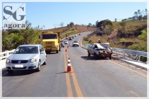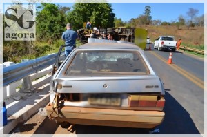 Um motorista de 55 anos de idade ficou ferido em um gravíssimo acidente ocorrido na manhã desta Sexta-Feira (26/08), na ponte do Córrego Fundo na BR 354 próximo ao trevo de entrada para a cidade de Lagoa Formosa. O fato aconteceu no início da manhã quando funcionários da empresa Sinal Mig, realizavam trabalho de colocação de um guard-rail no local. O transito no lugar estava sendo liberado parcialmente pelo chamado “PARE e SIGA”, quando o condutor do veículo que carga, transportando cerveja, que seguia sentido Patos de Minas à Carmo do Paranaíba, visualizou a placa de PARE. Ao acionar os freios o motorista teria notado falha mecânica no sistema. Neste momento ele não conseguiu parar o caminhão que seguiu pela pista em alta velocidade. Um automóvel VW/Gol, placas de Lagoa Formosa, que passava pela ponte foi atingido frontalmente. O motorista do carro foi socorrido até o Pronto Atendimento (PA) com fratura e ferimentos.