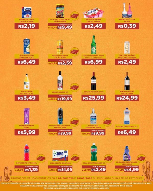 O Arraial de Ofertas do Supermercado São Vicente neste mês de Junho traz produtos em promoções como Frango Congelado à 4,99 o KG, Carne Moída Tudo Bom à 7,49 (unidade com 500 GR), Margarina Qualy (500 GR) à 4,99 a unidade (Cartão Clube de Descontos São Vicente), Filé de Peito à 5,99 o KG, Alcóol 70% (1 LT) à 6,49 a unidade, entre outras dezenas de produtos. As ofertas serão válidas até o dia 16 de Junho de 2020 ou enquanto durarem os estoques.