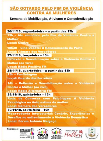 Com a finalidade de incentivar a consciência pública e estimular ações de prevenção e eliminação da violência contra a mulher no município de São Gotardo/MG, a Secretaria de Assistência e Promoção Social e o Conselho Municipal de Direitos da Mulher de São Gotardo/MG promoverão a semana de ativismo pelo Fim da Violência Contra a Mulher, através de diversas ações no município de São Gotardo/MG e no distrito de Guarda dos Ferreiros.