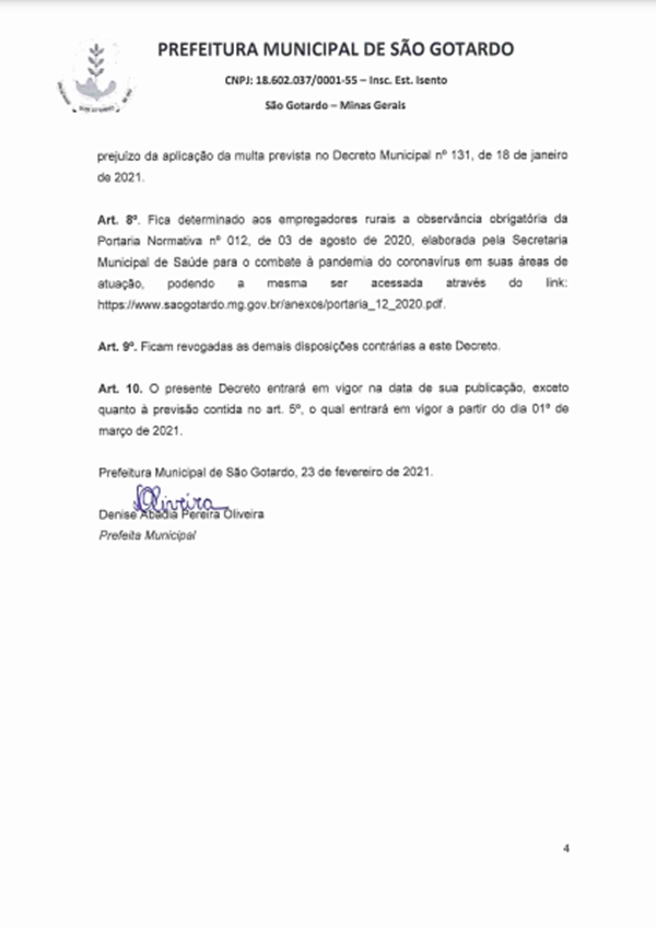 Todos os outros segmentos de estabelecimentos comerciais ou instituições não citados no Decreto, deverão seguir as regras de restrições impostas nos últimos Decretos publicados pela Prefeitura Municipal de São Gotardo no ano de 2021. A Prefeitura informa também que qualquer mudança, será publicada e divulgada em todos os meios de comunicação oficiais de São Gotardo.
