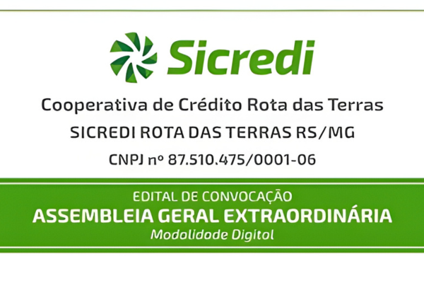 O Presidente da Cooperativa de Crédito Rota das Terras – Sicredi Rota das Terras RS/MG, no uso das atribuições que lhe confere o artigo 14 do Estatuto Social, convoca os senhores delegados de núcleo, que se acham em pleno gozo de seus direitos, para se reunirem em ASSEMBLEIA GERAL EXTRAORDINÁRIA, em primeira convocação, no dia 18 (dezoito) de novembro de 2025, às 7h30min, com a presença de 2/3 dos delegados; em segunda convocação, às 8h30min, com a presença de metade mais um dos delegados; e em terceira e última convocação, às 9h30min, com a presença mínima de 10 (dez) delegados, para deliberarem sobre a seguinte ORDEM DO DIA.