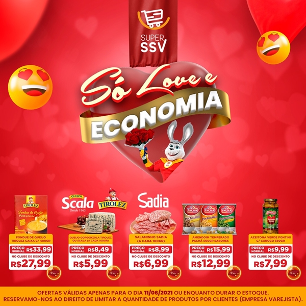 A data mais romântica do ano de 2021 está chegando e com ela mais uma super promoção no Super SSV (antigo São Vicente). Para comemorar o Dia de Namorados de maneira especial, o supermercado preparou ofertas apaixonantes para está sexta-feira (11/06), véspera da data comemorativa. Mas atenção, as ofertas só serão válidas no dia de hoje ou enquanto durarem os estoques dos produtos.
